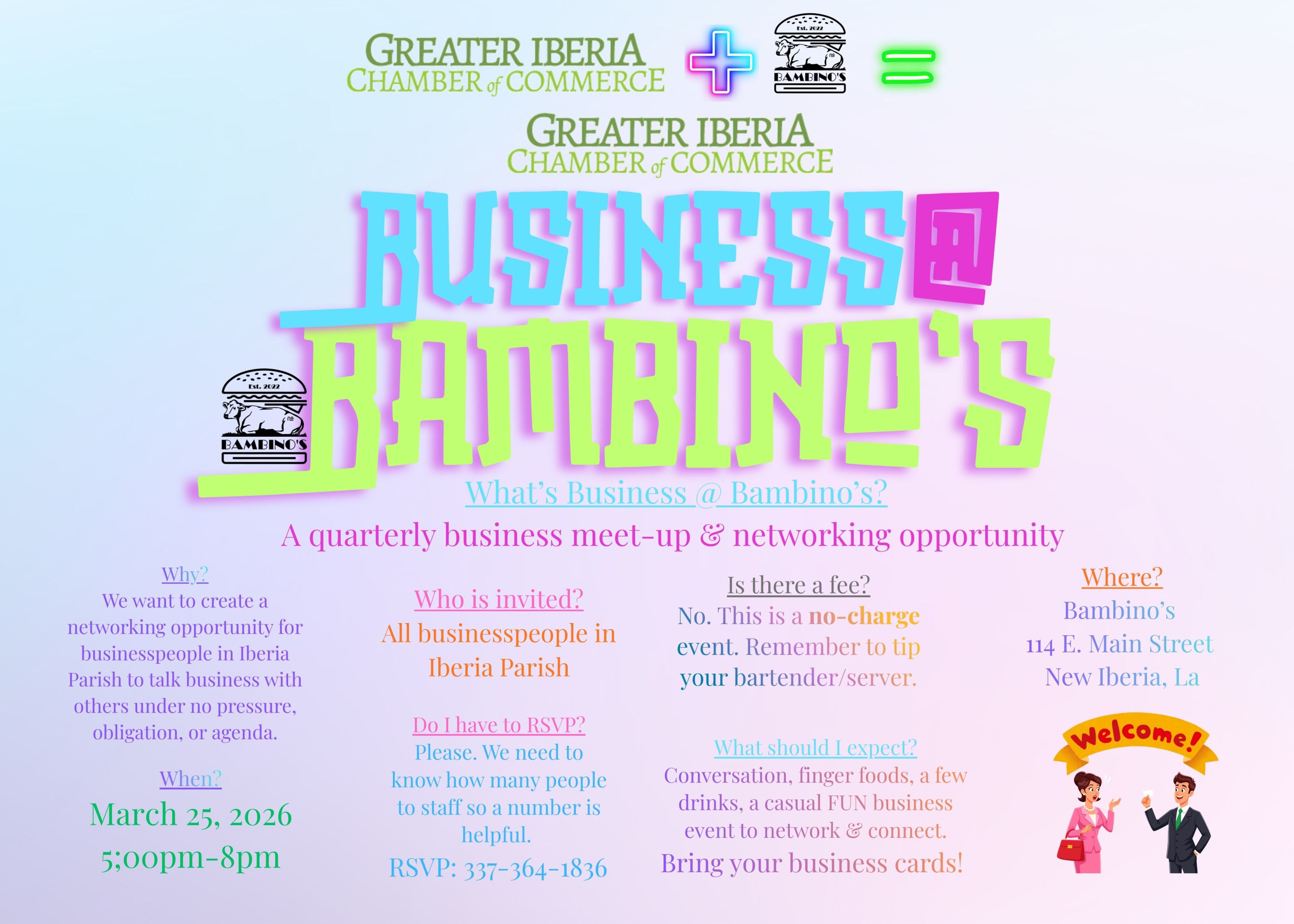 A quarterly business meet-up & networking opportunity for businesspeople in Iberia Parish to talk business with others under no pressure, obligation, or agenda. Expect conversation, finger foods, a few drink; a casual FUN business event to network & connect. Bring your business cards!