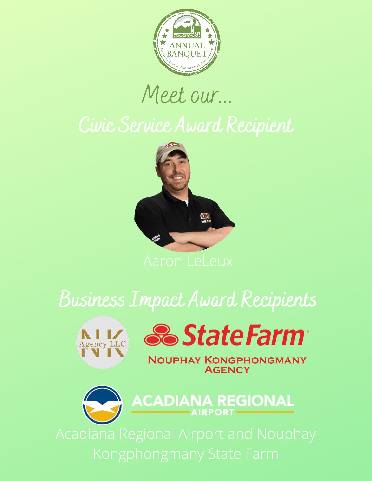 Lastly, at every Annual Banquet the Chamber recognizes one individual and two businesses who have contributed positively to Iberia Parish. The individual is recognized with the Outstanding Civic Service Award, which has been a tradition of the Chamber since 1947. They are someone who has shown exemplary service by volunteering their time and energy to our community.