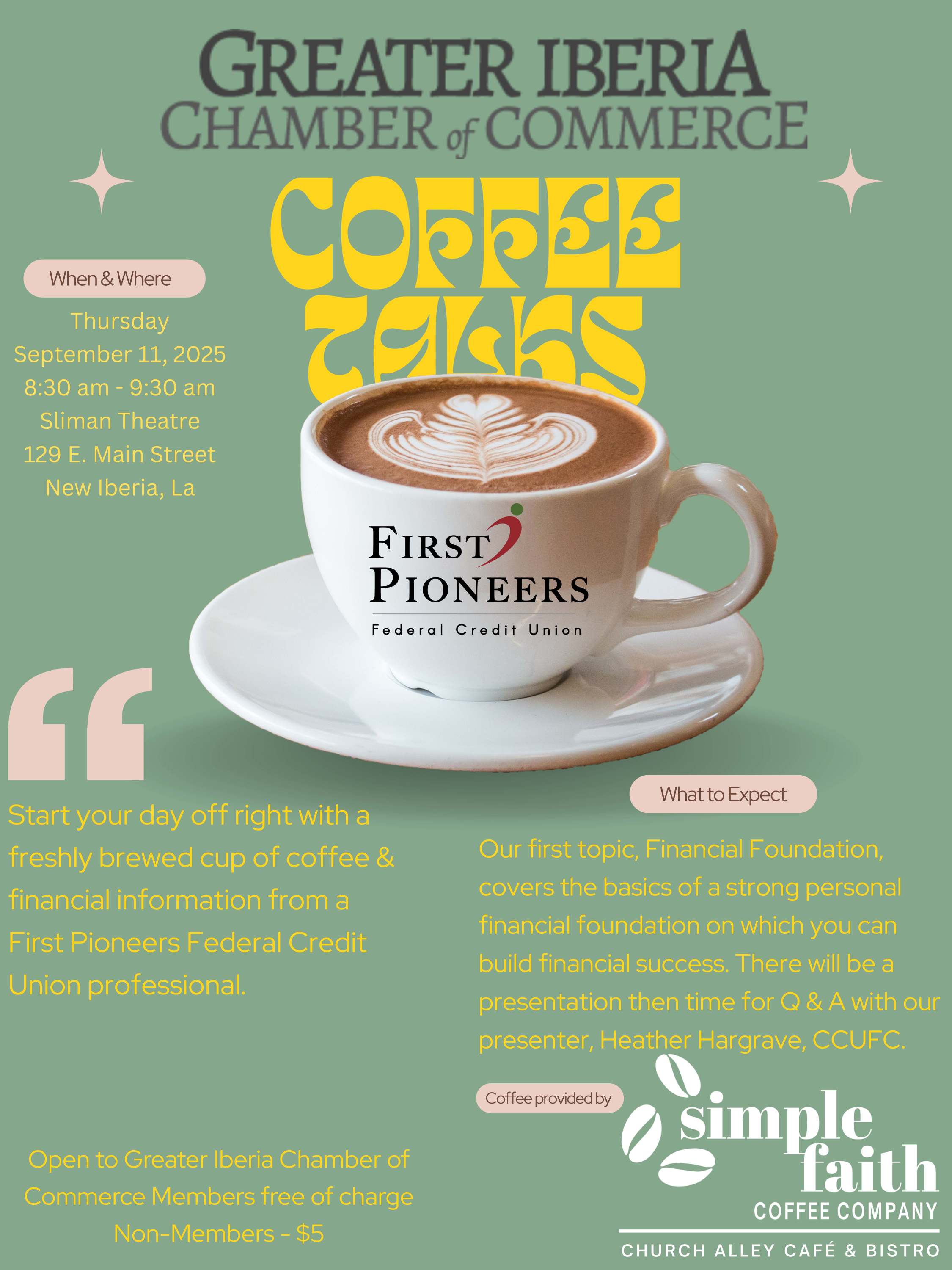 The Chamber will be hosting a series of semi-quarterly networking and educational opportunities for GICC members & guests to connect with local professionals over a broad range of topics. The first will be Financial Foundation, covering the basics of a strong personal financial foundation on which to build financial success. Heather Hargrave, CCUFC from First Pioneers Federal Credit Union will be the presenter. Simple Faith Coffee Company, Church Alley Cafe & Bistro, will be sponsoring the coffee.