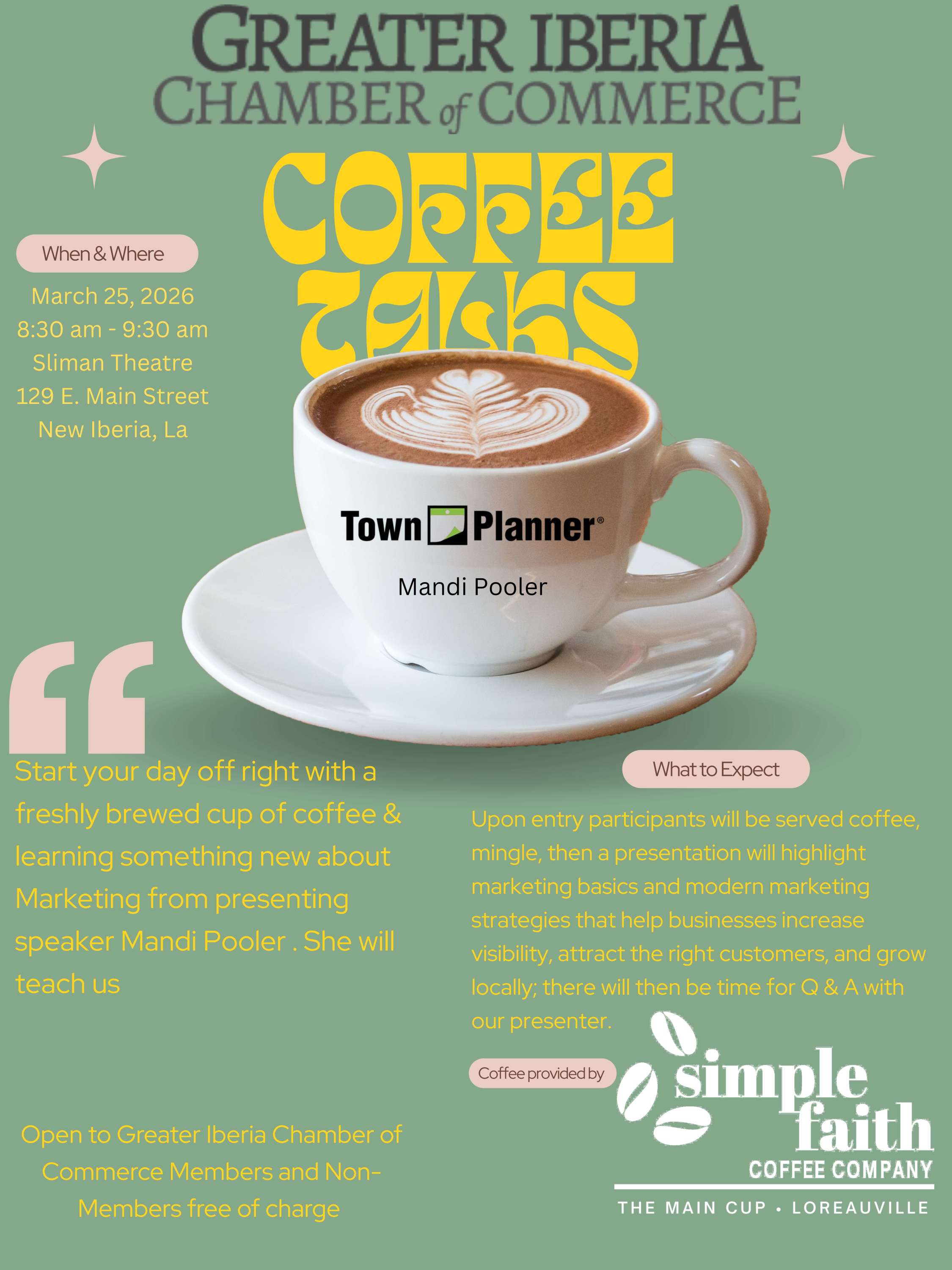 Join The Greater Iberia Chamber of Commerce for coffee provided by Simple Faith and conversation with presenting speaker: Mandi Pooler from Town Planner. She is going to be discussing marketing strategies for local businesses. Upon entry participants will be served coffee, mingle, then a presentation will highlight marketing basics and modern marketing strategies that help businesses increase visibility, attract the right customers, and grow locally; there will then be time for Q & A with our presenter. The event is exclusive to Greater Iberia Chamber of Commerce members.