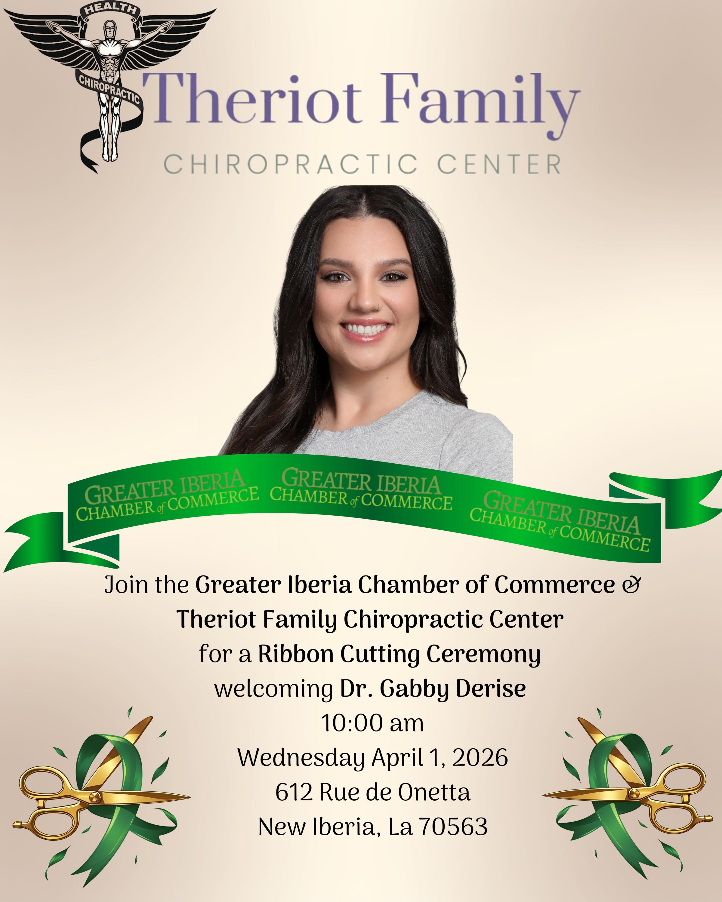 Join the Greater Iberia Chamber of Commerce & Theriot Family Chiropractic Center for a Ribbon Cutting Ceremony welcoming Dr. Gabby Derise. 10:00 am Wednesday April 1, 2026 612 Rue de Onetta New Iberia, La 70563Images